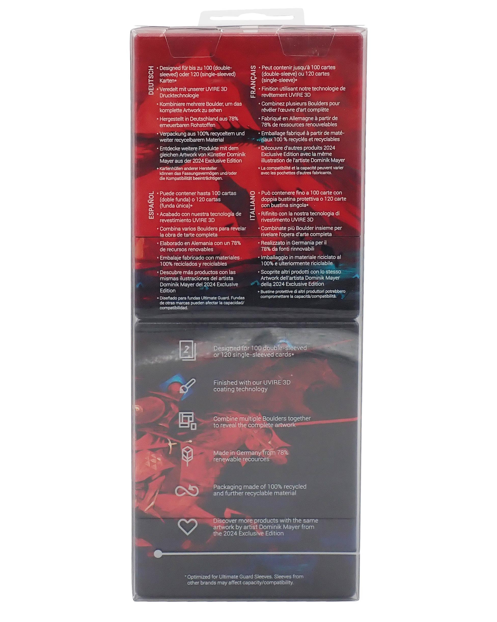 Illustrated by Dominik Mayer, one of Magic: The Gathering's most beloved artists, our 2024 Exclusives are true works of art. Finished with our new UVIRE 3D coating technology, both deck boxes each offer space for 100 double-sleeved cards. The RTE Boulder 100+ are made from 78% renewable resources in Germany. If you combine several deck boxes together, you can reveal the complete artwork: a sinister look into a world of knights and dragons!