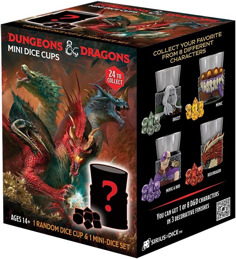 Level up your role-playing games with our Dungeons & Dragons: Mini Dice Cups, made of glass featuring intricate sculpts of iconic D&D characters with a mini-dice set included! Features: Blind Unboxings: Enjoy blind unboxings with a range of character cups categorized as Common, Rare, and Legendary. Collect them all to complete your set! Unique Character Cups: Reveal Iconic D&D Characters including Mind flayer, Mimic, Beholder, and more! Mini-Dice Set Included: Each cup comes with a mini-dice set, ensuring you have everything you need for your next adventure right out of the box. Rarity Levels COMMON Base Wash Sculpt with Single Color Acrylic Dice ODDS 1:2 RARE Painted Sculpts and Swirled Acrylic Dice ODDS 1:4 LEGENDARY Chase The Legendary Metal Plated Version ODDS 1:12 Discover Them All The Mimic Drizzt Minsc & Boo Red Dragon Elminster Beholder The Grung Mind Flayer