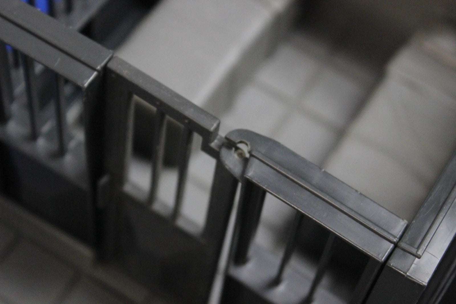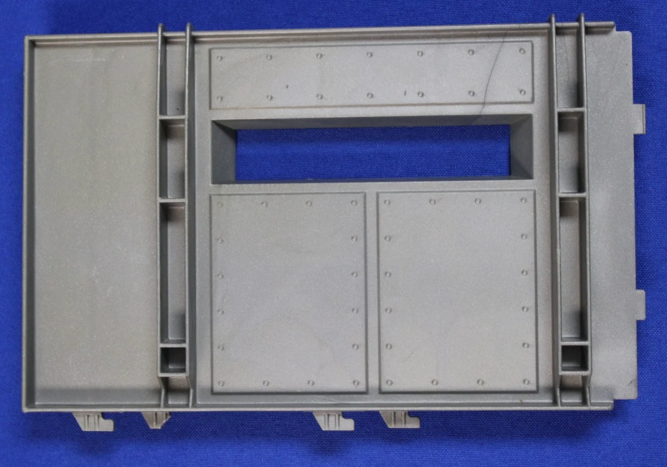 Some pieces are missing. There is a damaged duplicate of the front right wall. One half wall for the center base has damaged connector teeth. The stockade bar door is damaged where it swivels. Some other pieces are chipped. Some stickers are missing and other stickers have begun to peel.