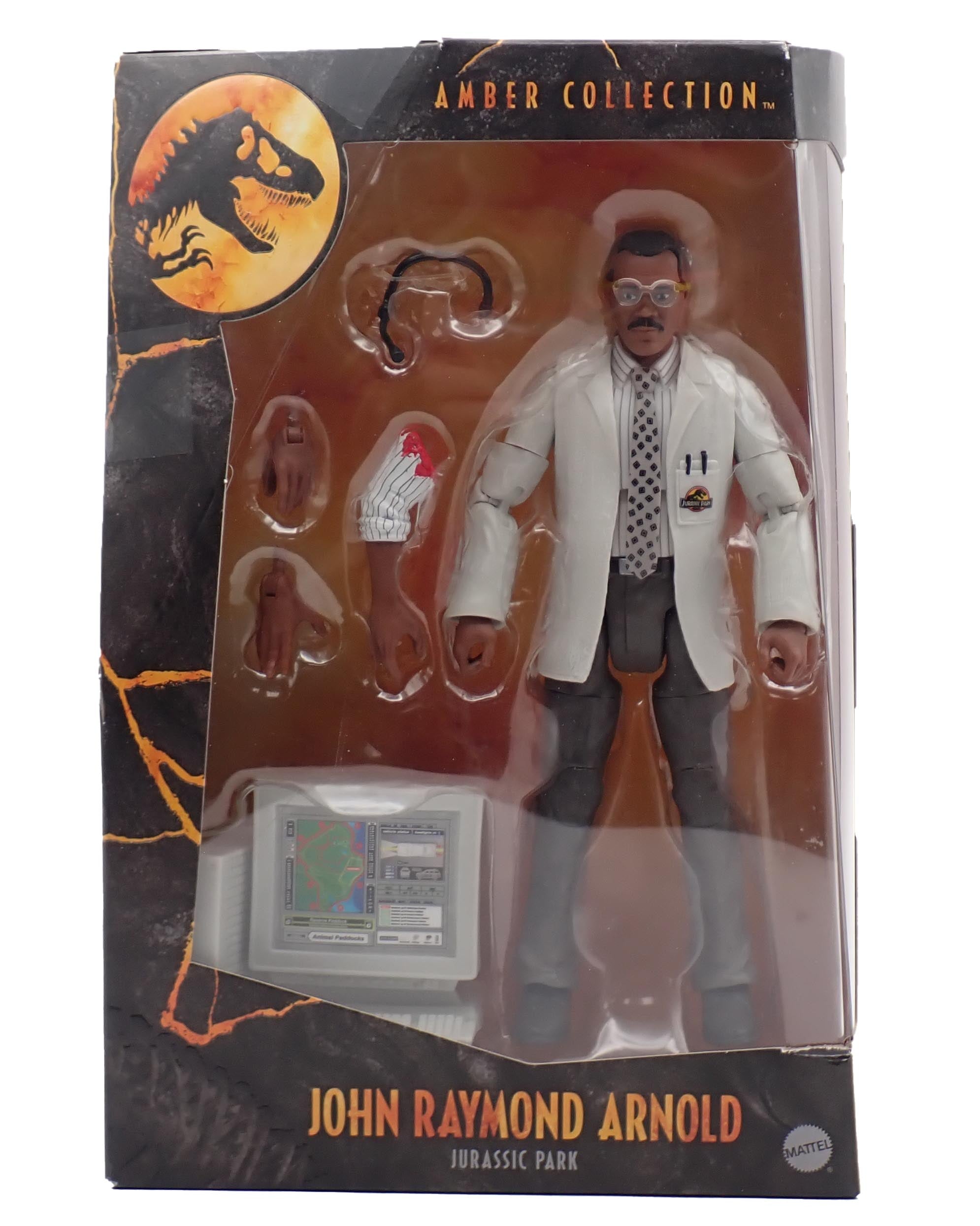 Sealed in box figure of John Raymond Arnold as he appears in Jurassic Park.