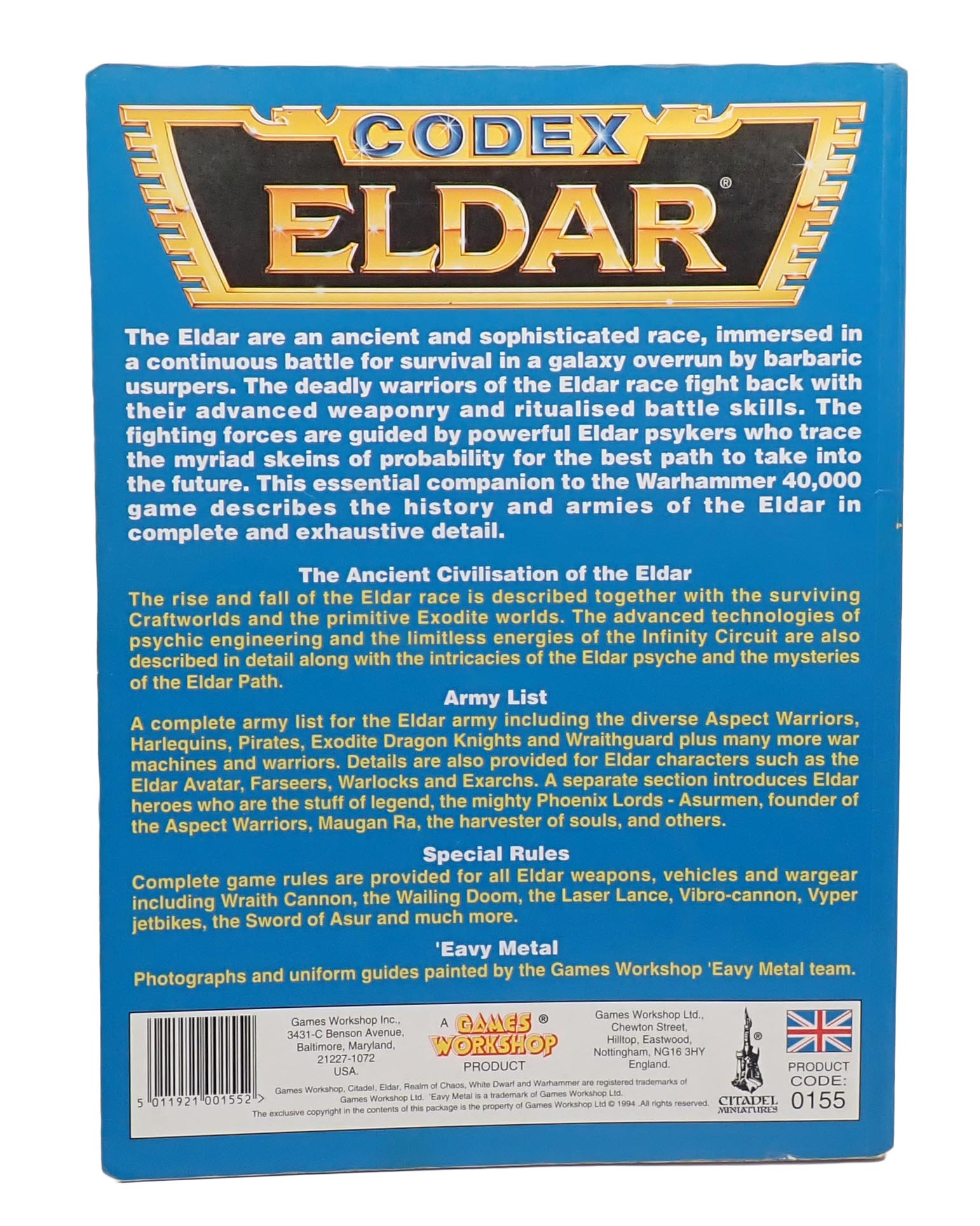 Warhammer 40,000: Eldar Codex Supplement published in 1994, in good condition with minimal wearing along corners, edges, and spine.