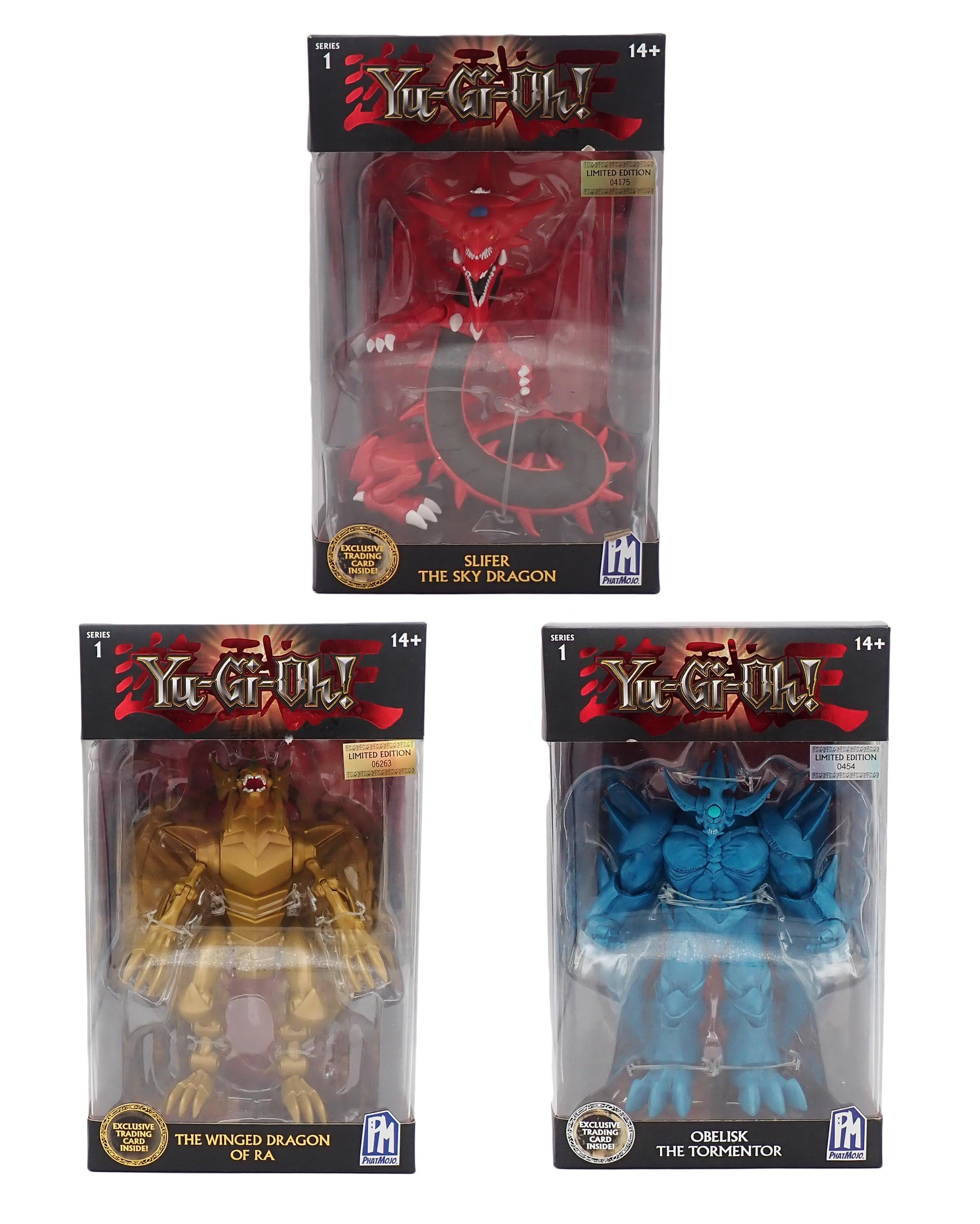 Sealed PhatMojo Yu-Gi-Oh! Series 1 figure set of Slifer The Sky Dragon, The Winged Dragon of Ra, and Obelisk The Tormentor.